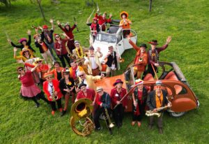 Cuivre, bois, percussions… plus d’une vingtaine de musiciens s’en donnent à cœur joie pour nous proposer un répertoire de fanfare moderne. Affublés de costumes plus loufoques les uns que les autres : chapeaux en tous genres, vestes bariolées, couleurs pétantes, plumes et accessoires clownesques, tout y est, on en prend plein les yeux. Chaque morceau, qu’il soit dynamique ou – légèrement – plus calme, est accompagné d’une mise en scène chorégraphiée, souvent pleine d’humour. La qualité musicale n’est pas en reste. Des solistes ponctuent habilement les compositions, l’ensemble est harmonieux, dirigé de façon méticuleuse par le chef d’orchestre, Sylvain Mazens, qui ne se contente pas de jouer d’un instrument lui-même et de battre la mesure. Mi-chef d’orchestre mi-mime, au travers d’un langage gestuel défini, le soundpainting, il guide l’intervention des musiciens avec grande précision, lui permettant d’adapter les compositions dans l’énergie du moment ou de composer en temps réel. Et il a toute l’attention, celle de l’harmonie qui ne le quitte pas des yeux, mais également celle du public qu’il embarque habilement durant plus d’une heure de liesse. Lors de ce beau moment de partage les spectateurs dansent, chantent, frappent le tempo, transportés par cette bande de joyeux fanfarons.