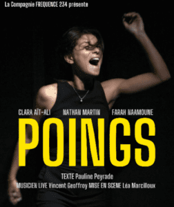 Poings est une pièce d’une intensité sidérante, à l’image même d’un coup de poing porté au cœur. Le décor, ultra minimaliste — un drap blanc tendu en fond sur un sol immaculé — fait office de double fonction : mur contre lequel la protagoniste se heurte, mais aussi cage mentale où elle est piégée. Ce mur écran symbolique reflète l’enfermement progressif, physique et psychologique, qu’impose l’homme qu’elle aime.